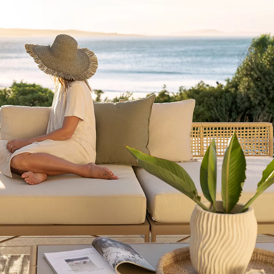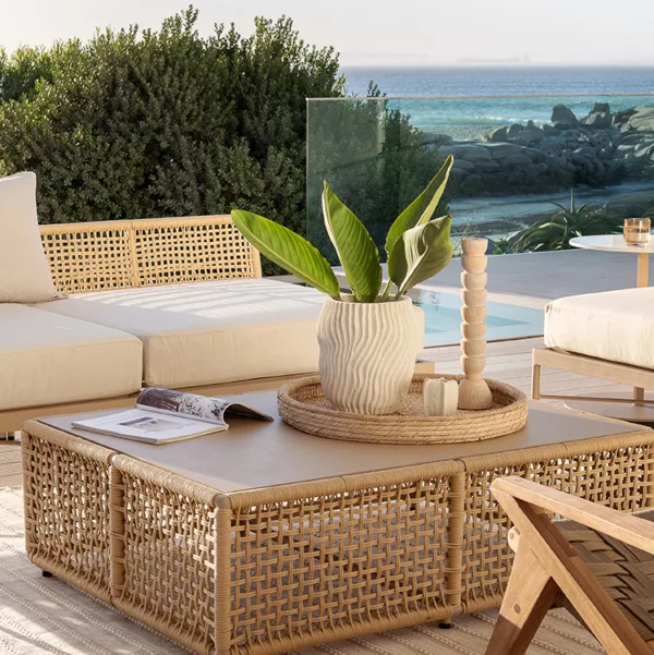 The Zoë Modular Sofa brings together a sleek, low-profile frame and intricate woven detailing for a refined, tropical-inspired aesthetic.